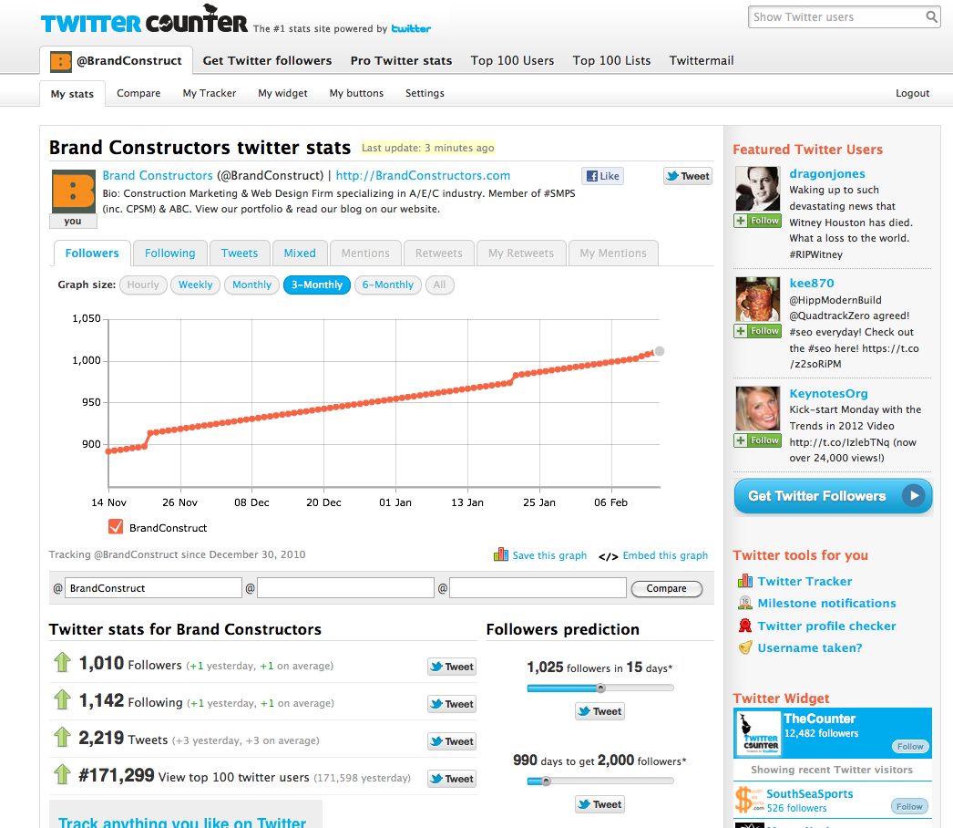 First, look at some of the basics like website visits including where they are from, Facebook likes, Twitter followers, etc. You should slowly see increases in each of them. For specific metrics, we use sites like Twitter Counter (see graphic on right), Twitaholic, and Twitter Grader. Twitter Counter shows a steady increase in followers over the last 6 months while Twitaholic shows your rank in the Twitterverse such as 184,875th for us (actually not bad for our narrow vertical audience). One of our favorites is Twitter Grader, part of Hub Spot’s grader.com series, because it looks at more than just followers and retweets and gives you a full report including steps to increase your score. We regularly score around 95 out of 100! Another great thing about these tools, besides they are all free, is that they are open to view other tweeters – just add the username and you get their metrics.