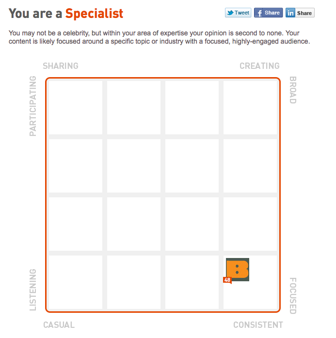 For a more universal metric that reviews everything, we recommend Klout and Marketing Grader (also part of the grader.com series). Klout aggregates all of your social media and continually adds other media channels, although we’re still waiting on the blog feature to be added. Own of our favorite features is the Style guide that shows what you talk about – as you can see, we stay pretty focused and consistent on our topics of construction, branding, marketing, social media, and AEC. Marketing Grader, formerly website grader, takes everything into consideration including your blog, social media channels, website, and overall online presence and gives you a highly detailed report. Don’t feel bad about getting low scores on either of these, they are tough and take time to improve. Beware, abandoning your social media for only a couple of weeks can reek havoc over your scores – trust me, a vacation including a hectic schedule just before and after vacation dropped our score.