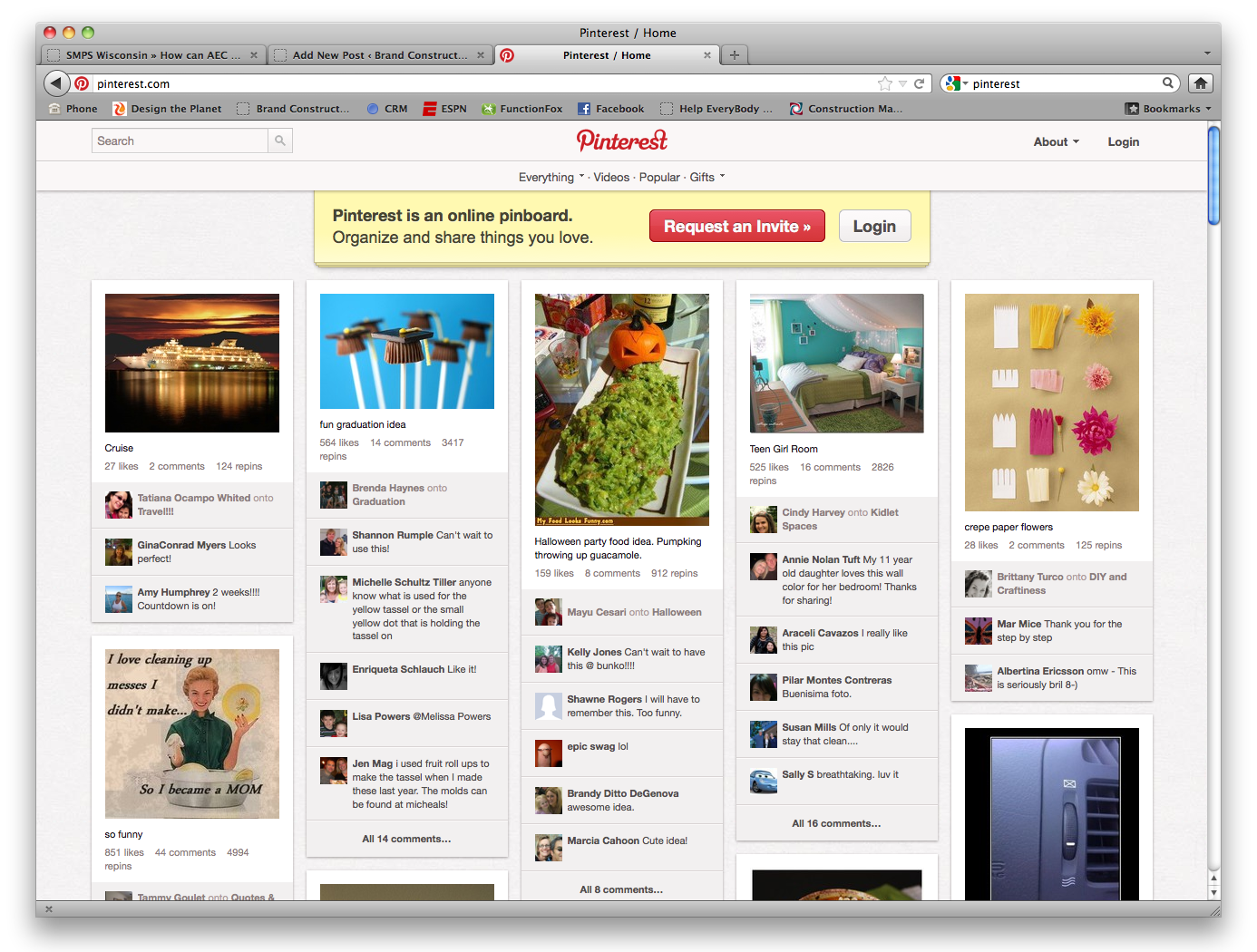 After doing some research (playing on my wife’s Pinterest account), discussing it in the weekly #AECSM tweetchat, and then I read a great article by SMPS Wisconsin on Pinterest, I saw this as a great opportunity for any business that can differentiate by design, creativity, and innovation. Artists & crafters on Etsy.com are loving Pinterest as should architects, designers, and builders because it can easily bring visitors to your work and then to your website to purchase your work. For B-to-B companies like in the A/E/C (Architect/Engineering/Construction) industry, Pinterest is an online scrapbook or portfolio of your greatest work.