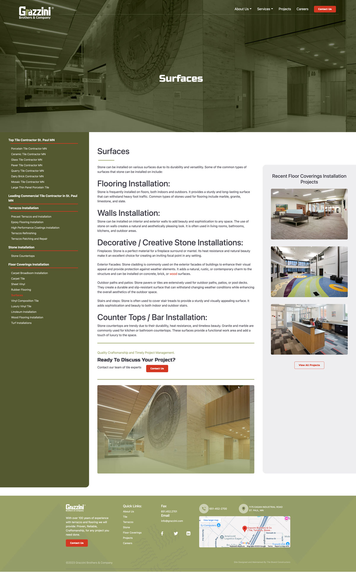Founded in 1923, this resource-heavy national commercial flooring and surfaces contractor, headquartered in Eagan, Minnesota, needed a new website representative of its capabilities and national footprint. Their goal was to improve the look and navigation, and to strategically add search-engine optimization bringing attention and focus to certain content.
